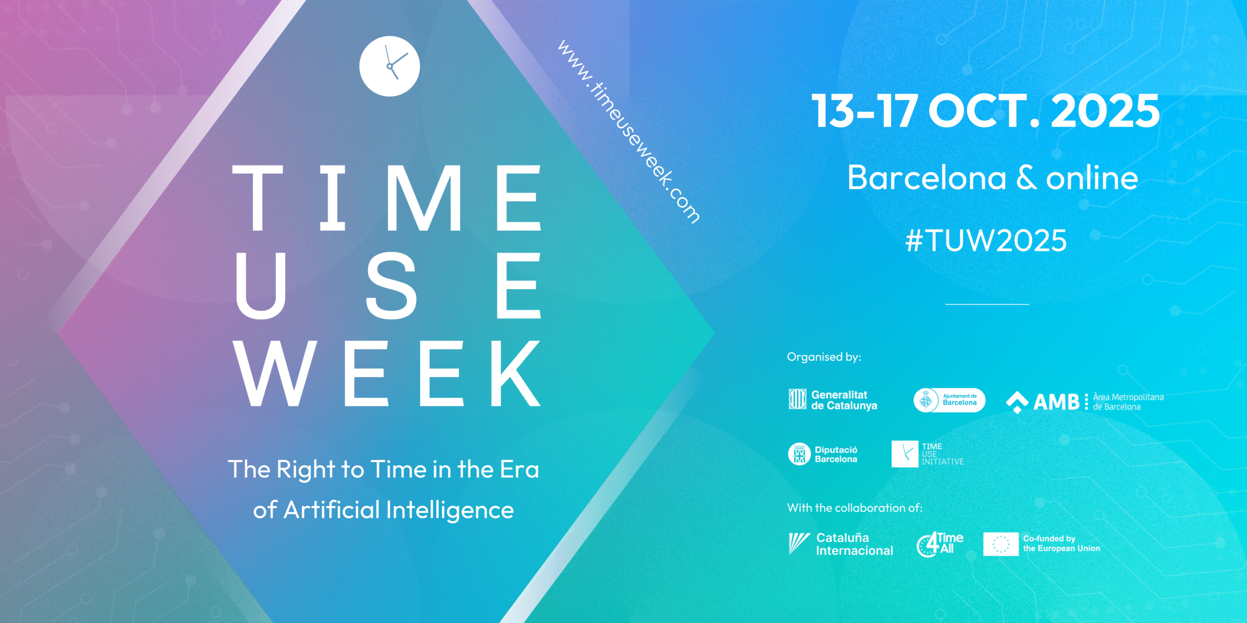 Time Use Week 2025, the twelfth edition, is framed within “The Right to Time in the Era of Artificial Intelligence” and will hold its main events from October 13 to 15 in Barcelona and online via YouTube. TUW 2025 will focus on how the emergence of artificial intelligence, and more broadly, technological advances, presents us with a new horizon of possibilities for addressing the challenges of improving the organization of time use by 2050.